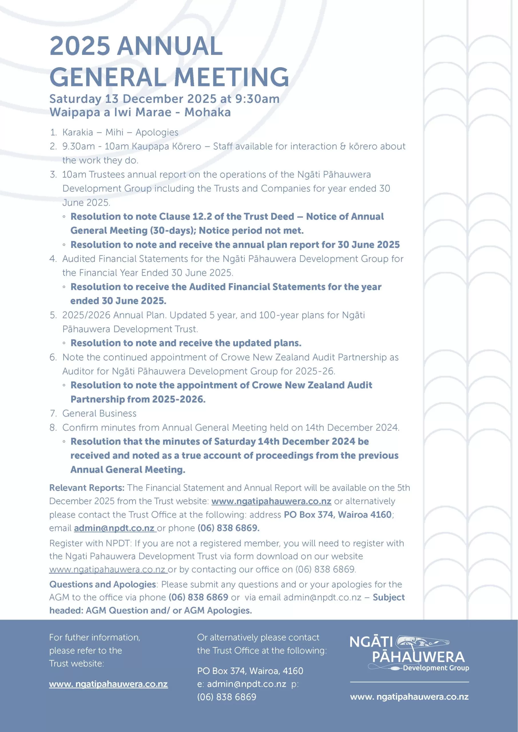 Ngāti Pāhauwera Development Trust provides notice and invites all its members to the 2025 Annual General Meeting on Saturday 13th December 2025 to be held at Waipapa a Iwi Marae – Mohaka.